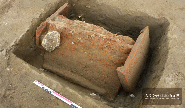 En l’absence de mobilier, seules quelques tegulae et un récipient en céramique, offrent un TPQ au IIe siècle après J.-C. Cette datation et la localisation de la nécropole permettent d’établir sa contemporanéité avec l’occupation du bâtiment.