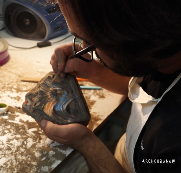 Notre équipe a ainsi eu la chance de découvrir des mosaïques noires et blanches (fig. 5), ainsi que des fragments des fresques qui ornaient les murs. Parmi les matériaux, on note la présence de marbres d’importation. Plusieurs antéfixes ont surgi au milieu des ruines des toitures de tuiles ou en remploi dans les murs (fig. 6). Ces plaques décoratives, fixées en rive basse des toits, formaient une frise de visages et de végétaux rehaussés de couleurs (fig. 7) – c’est une découverte tout à fait remarquable !