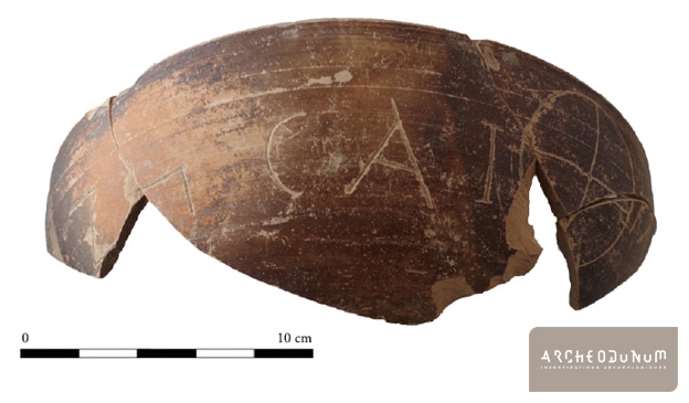 La villa de la Sarrazinière a été habitée entre le début du Ier s. et le milieu du IIIe s. après J.-C. Durant cette longue période, les résidents successifs ont procédé à diverses transformations. Il s’agit de témoignages de la fréquentation des lieux et de choix esthétiques et structurels. La vie des habitants est également illustrée par des graffitis incisés sur des poteries. Une de ces inscriptions est en langue grecque, ce qui est une découverte assez rare (fig. 9). Elle permet de reconnaitre des individus cultivés qui connaissent une langue étrangère. La villa est finalement abandonnée au milieu du IIIe s., vraisemblablement à la suite d’un incendie.