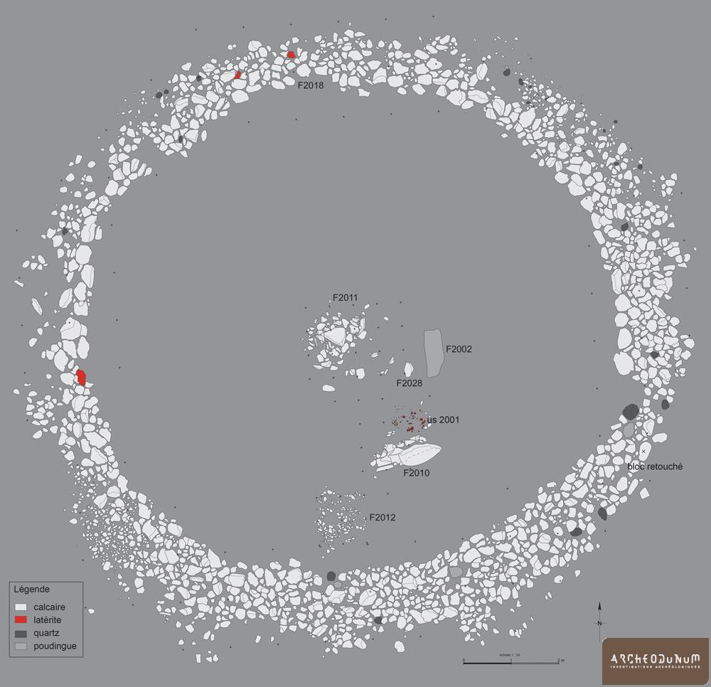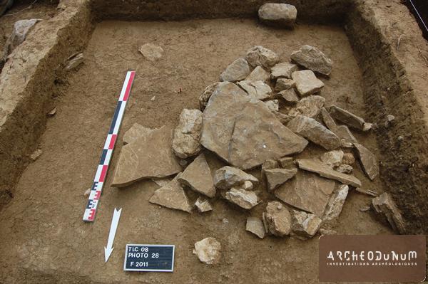 Le « monument funéraire » est l’élément le plus visible de cette zone. Contrairement à ce qui était attendu, aucun coffre n’a pu être retrouvé. Seules des dalles isolées, en position secondaire ont été mises au jour, de même qu’un amas de dalles et de blocs fracturés, au centre du monument. Aucune datation directe ne peut être proposée, faute d’élément matériel. Seul un terminus post quem, donné par le matériel Bronze final retrouvé dans les terres de recouvrement, peut être avancé. De même, la destination réelle de ce monument ne peut être clairement établie. L’hypothèse d’un cénotaphe peut être avancée.