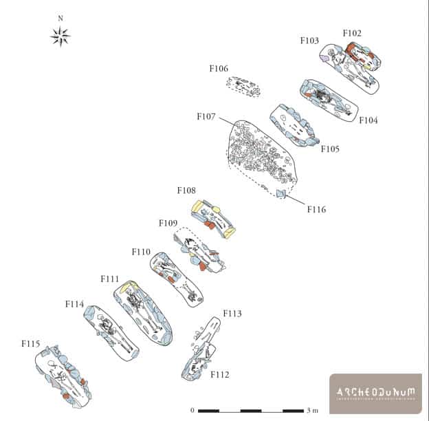 Les tombes sont alignées les unes à côté des autres selon un axe nord-est/sud-ouest, et présentent toutes la même orientation (nord-ouest/sud-est), exceptées deux d’entre elles orientées nord-est/sud-ouest. Dans cinq cas, les tombes ont été ré-ouvertes à l’époque afin d’y placer un ou plusieurs nouveaux défunts. Dans ce type de manipulations, les os du squelette précédent peuvent être regroupés à un endroit à l’intérieur de la tombe (c’est ce que l’on appelle une réduction) comme c’est le cas dans deux tombes ici, ou replacés dans la partie supérieure de la tombe, lors du comblement final, avec moins de soin (trois tombes sont concernées ici). Les squelettes déplacés n’ont pas conservés leur intégrité. Cela signifie qu’une partie des squelettes est retirée de la sépulture et emmenée dans un autre lieu. De telles pratiques sont connues par ailleurs et ne doivent pas être perçues comme un manque de respect vis-à-vis des défunts. La population est constituée de 12 adultes (deux hommes et trois femmes reconnus) et huit enfants. On notera l’absence de périnataux et de nourrissons.
