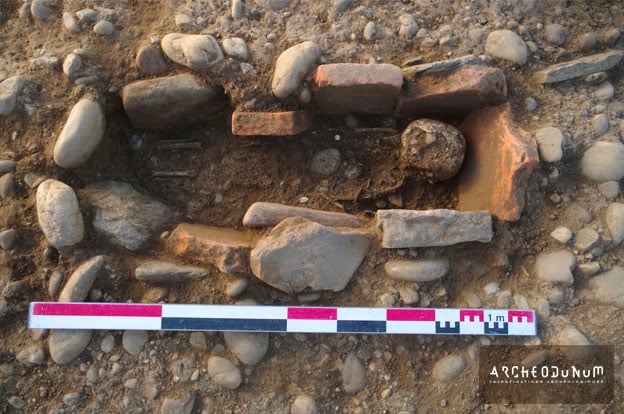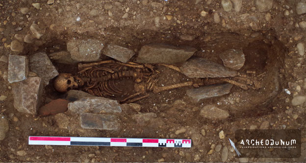 La fouille extensive de cette parcelle a donc permis la mise au jour de quatorze sépultures. Elles se caractérisent par la présence de coffrages en pierres assez sommaires et composés de matériaux hétéroclites : dalles de gneiss, de schiste, galets, blocs de calcaire, ou encore de grès, ainsi que quelques éléments architecturaux en terre cuite (tuiles et briques). Dans certains cas, des dalles recouvraient la tombe. C’est ce type de construction qui avait permis d’envisager la datation de ces tombes, qui a été confirmée par les datations radiocarbones effectuées sur les ossements de six d’entre elles. Ces dernières offrent une fourchette chronologique comprise entre la fin du VIIe et la fin du IXe siècle. Le mobilier funéraire est quasiment absent puisque seules deux éventuelles lames de couteau en fer ont été découvertes dans une sépulture d’enfant.