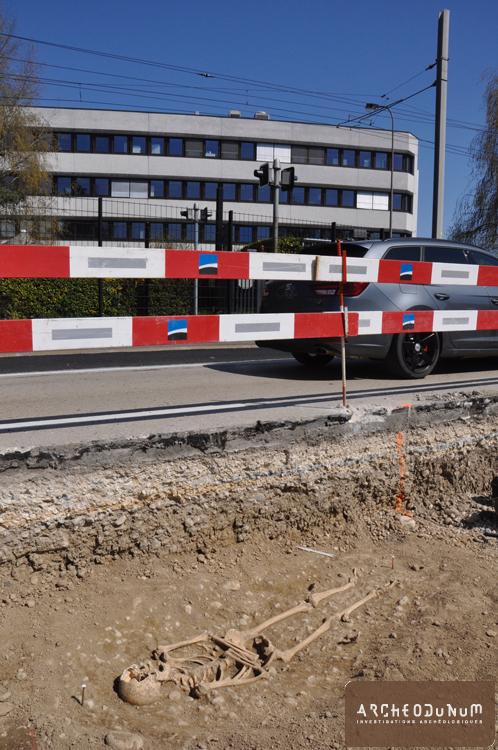 La réfection des axes routiers principaux dans le sud de la ville d’Orbe a nécessité un suivi archéologique sur toute la durée des travaux. Lors de cette opération, un cimetière d’époque médiévale a notamment été mis au jour sous la route en direction de Chavornay, probablement en lien avec l’ancienne église Saint-Martin. Fouillé que partiellement, cet espace funéraire a pu être observé sur presque 100 m de longueur ; seule sa limite occidentale a pu être appréhendée, matérialisée par la voie Lausanne-Yverdon (Route de l’Étraz), de construction romaine.