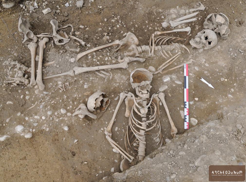Implantées selon des orientations variables, les tombes sont organisées en plusieurs ensembles peu espacés, comptant jusqu’à trois niveaux de recoupements. Ces noyaux pourraient correspondre à des « concessions familiales », utilisées sur un temps assez long, certaines accueillant des adultes et des enfants, d’autres uniquement des adultes. Peu présents dans ce corpus, les tout-petits (0-4 ans) ont peut-être été enterrés dans un secteur réservé de l’aire funéraire, non découvert à ce jour. Le sexe des individus adultes ne semble pas un critère de répartition, même si l’échantillon est peu représentatif (18 déterminés, soit 11 femmes et 8 hommes). Enfin, la confrontation de la chronologie relative, principalement basée sur les orientations, et des analyses 14C permet de définir au moins trois phases d’utilisation, avec des « concessions » qui fonctionnement en parallèle.