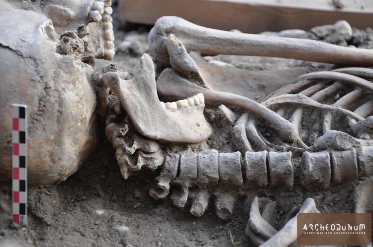 Au total, 60 sépultures à inhumation ont été repérées, dont 17 qui n’ont pas été fouillées car non menacées par le projet actuel. Lors de l’étude biologique, un minimum de 42 individus a été dénombré, soit 32 adultes et 10 immatures. Les défunts ont été inhumés sur le dos, généralement dans des contenants en matériaux périssables (coffrages de planches ou fosses couvertes). On recense aussi quelques cas (5) d’inhumations en pleine terre. Dans au moins huit cas, un soin particulier a été apporté à la tête, surélevée grâce à un support en bois ou un coussin. Aucune sépulture n’ayant livré de mobilier, ce sont les analyses 14C effectuées sur les squelettes qui permettent de situer l’utilisation du cimetière entre la fin du 8e s. et la seconde moitié du 13e s.