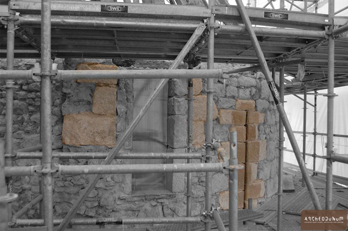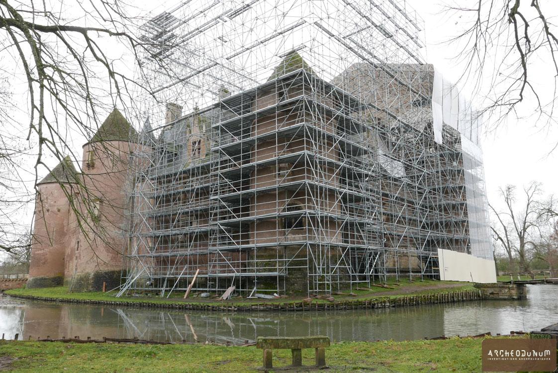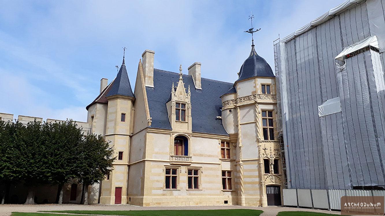 Avec ses neuf tours reliées par de hauts murs de courtine crénelés, le château médiéval d’Ainay-le-Vieil se dégage du paysage de plaine qu’il occupe. À partir de 2020, le logis construit à l’intérieur de l’enceinte au cours de la Renaissance a fait l’objet de travaux de grande ampleur. Cette restauration a concerné les façades et les toitures du logis, ainsi que les tours et les courtines médiévales englobées par son implantation. Du fait de l’intérêt patrimonial du site, qui est par ailleurs officiellement reconnu par un classement au titre des monuments historiques depuis 1968, la Conservation Régionale des Monuments Historiques a souhaité que ces réfections soient accompagnées par une étude archéologique du bâti, tant sur les élévations maçonnées que charpentées. Les archéologues sont ainsi intervenus régulièrement pendant le chantier, entre le 20 janvier 2020 et le 22 mars 2022, afin d’apporter de nouvelles connaissances sur le château médiéval et le logis de la Renaissance et leurs transformations postérieures.