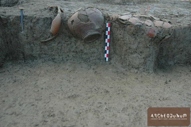 La fouille archéologique s’est déroulée sur les secteurs de la zone funéraire au nord et de l’édifice quadrangulaire au sud. Elle a permis de mettre au jour une nécropole composée de 19 sépultures à crémation, 26 fosses de résidus, huit dépôts de céramiques et quelques pierres de marquage. S’y ajoute quelques structures associées, dont deux fosses à amphores, un aménagement insolite constitué d’un escalier conduisant à une grande fosse et quatre inhumations d’Équidés.