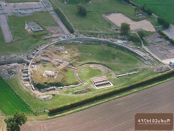 La construction du théâtre intervient au début de la seconde moitié du Ier siècle de notre ère, soit près d’une génération après l’aménagement du complexe organisé autour de l’esplanade triangulaire. On observe donc une succession des projets à un rythme soutenu. Cet édifice est muni d’une cavea de plan semi-circulaire outrepassé, caractéristique des monuments de type gallo-romain. Son diamètre de 82 m permet d’évaluer sa capacité à 5 000 personnes. Le dispositif scénique, s’avançant dans l’orchestra, consiste en une estrade de petites dimensions appuyée contre le mur de scène. Les accès sont constitués de couloirs latéraux, débouchant dans l’orchestra, et d’escaliers ou de rampes adossés à la cavea, desservant des couloirs rayonnants. À l’ouest, le théâtre est flanqué d’une vaste cour (porticus post scaenam).