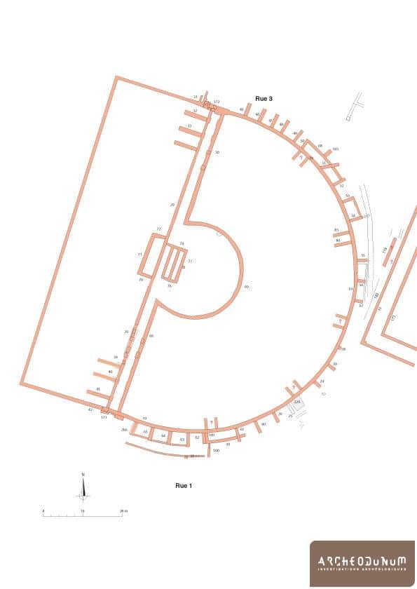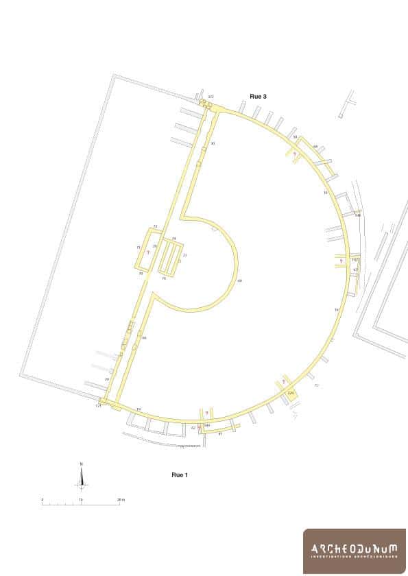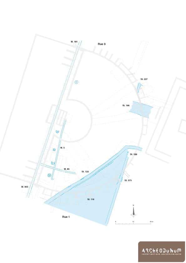 Ces aménagements sont désaffectés par l’apport de remblais et par le creusement d’une tranchée curviligne relativement concentrique au mur périmétral du théâtre, mais dont le diamètre est légèrement inférieur. Si l’hypothèse d’un premier théâtre ne peut être définitivement abandonnée, l’absence de traces significatives de construction nous incite à considérer ce creusement comme le tracé abandonné d’un premier projet de théâtre.