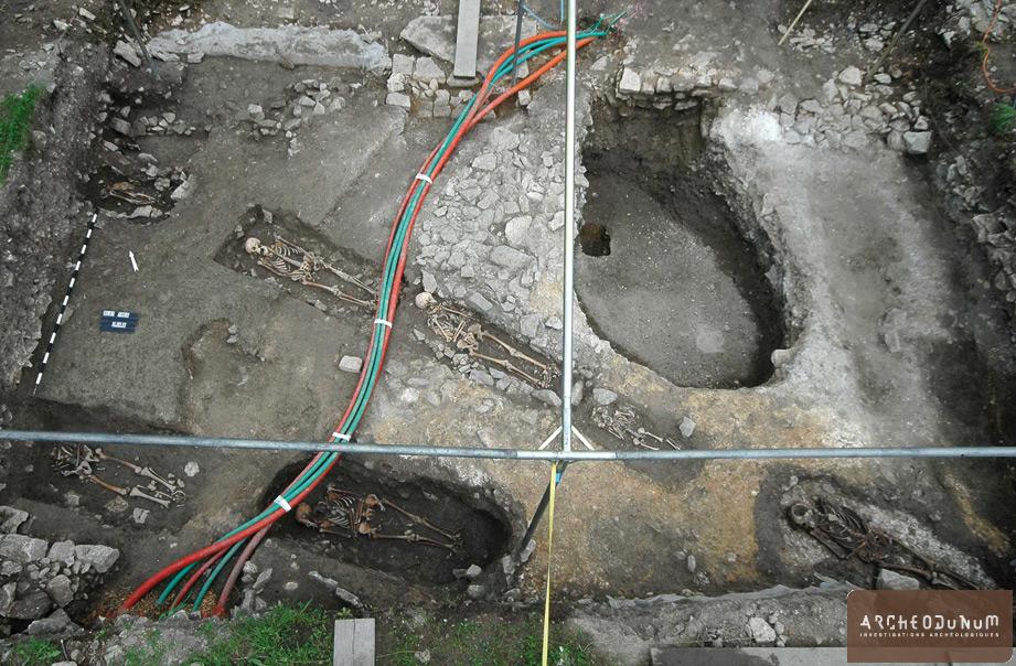 Un petit groupe de tombes à inhumation appartenant sans doute à une nécropole plus vaste a été découvert au sud-ouest du monument. Ces sépultures n’ont pas livré de mobilier permettant de préciser leur datation, mais la relative proximité de la basilique mérovingienne de Sainte-Reine, édifiée au Ve siècle apr. J.-C., en fait toutefois une piste privilégiée en l’absence d’autres arguments.