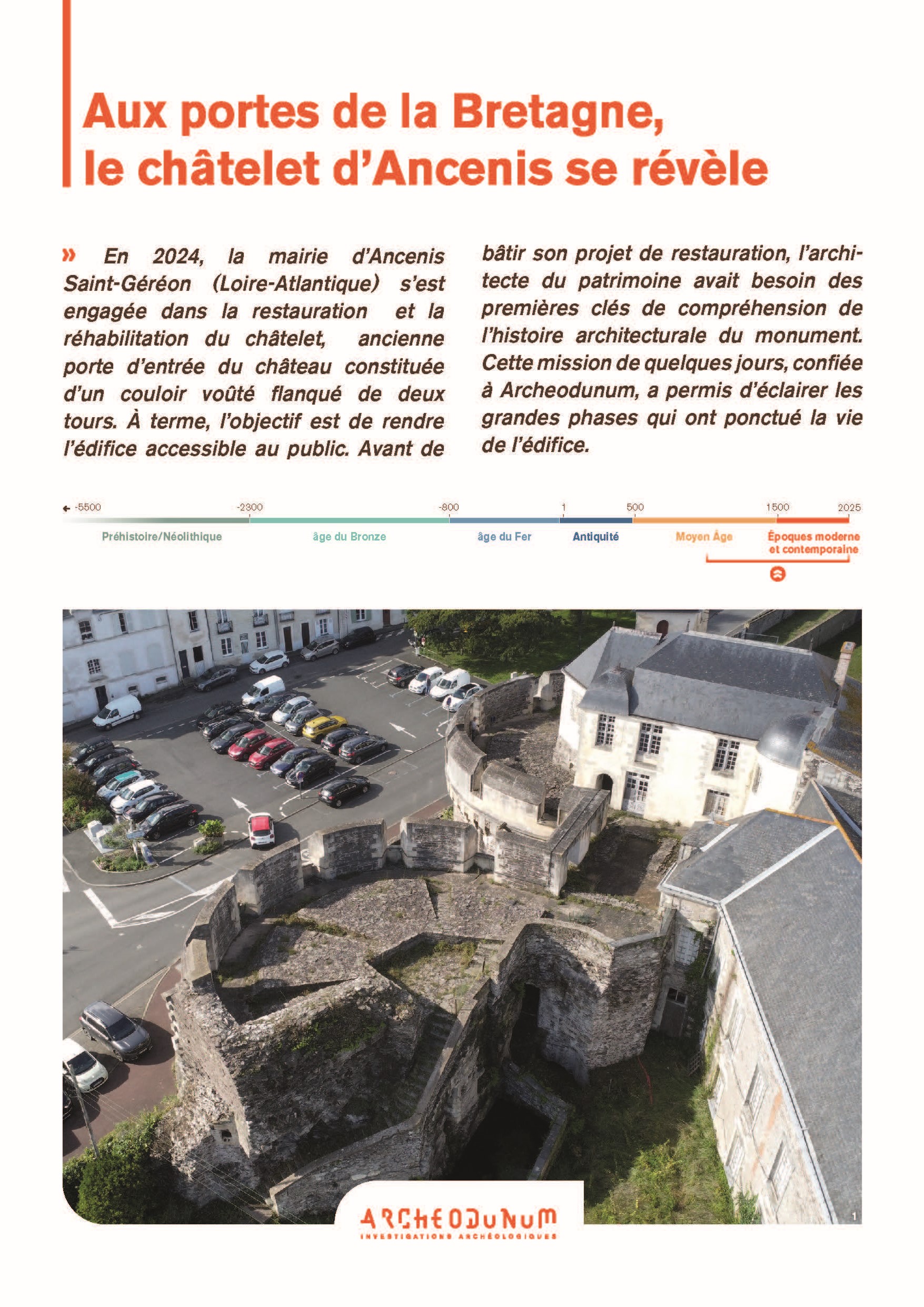 Le châtelet d’entrée, dont fait l’objet le présent rapport, est composé de deux tours circulaires encadrant un passage coudé. Ce vestige se trouve aujourd’hui dans un état sanitaire alarmant, et ce malgré les restaurations de ses parties sommitales dans les années 1990. C’est pourquoi la mairie d’Ancenis a confié la maîtrise d’œuvre au cabinet d’architecte Post, qui doit remettre en 2025 un diagnostic sanitaire et architectural ainsi qu’un projet de restauration. Dans ce cadre, une pré-étude archéologique du bâti, encadrée par un cahier des charges, a été diligentée par le Service Régional de l’Archéologie pour accompagner ce diagnostic architectural. L’objectif est de permettre aux différents acteurs en charge du dossier d’avoir des données factuelles sur les différents programmes de construction et un premier phasage du monument, ainsi que des clés de compréhension de l’organisation fonctionnelle, la distribution des différents espaces et la circulation entre ces derniers. Enfin, tout au long de l’étude, ces observations sont confrontées à la bibliographie disponible sur le site et compilée dans le cadre de l’étude historique, dont la réalisation a été confiée à la société Chroniques conseil.