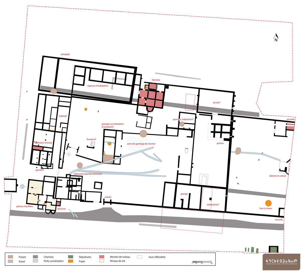 Si cette occupation perdure jusqu’à la période augustéenne, il faut ensuite attendre la fin du Ier ou le début du IIe siècle de notre ère, pour constater l’implantation d’un vaste complexe inscrit dans une enceinte composée de murs à base de pierre sèche. Si la définition de cette occupation devrait être avantageusement précisée suite à la fouille de la parcelle adjacente (J. Galy, rapport en cours) on peut d’ores et déjà en tracer les grandes lignes. Un vaste enclos muré dont l’orientation suit approximativement celle des enclos laténien, qui est aussi celle de la plus grande pente, enserre une surface d’environ 4175 m2 (72 m x 58 m). Si l’entrée principale est manifestement située sur la façade orientale, une porte secondaire est aménagée dans le flan nord de ce périmètre, autour de laquelle on retrouve plusieurs inhumations de périnatals. Dans l’angle nord-ouest de cette enceinte, un bâtiment de 10,50 m par 6 à 19 m hors tout, offre une surface interne potentielle comprise entre 49 m2 et 155 m2. Des contreforts permettent d’envisager la présence d’une élévation relativement importante, en lien notamment avec la pente.