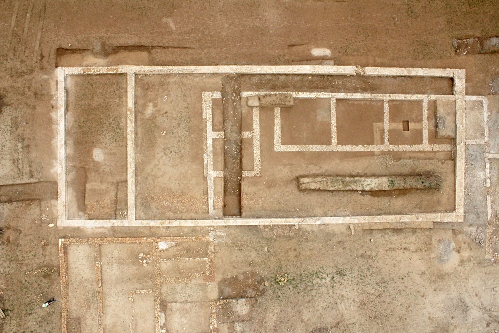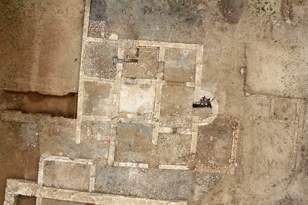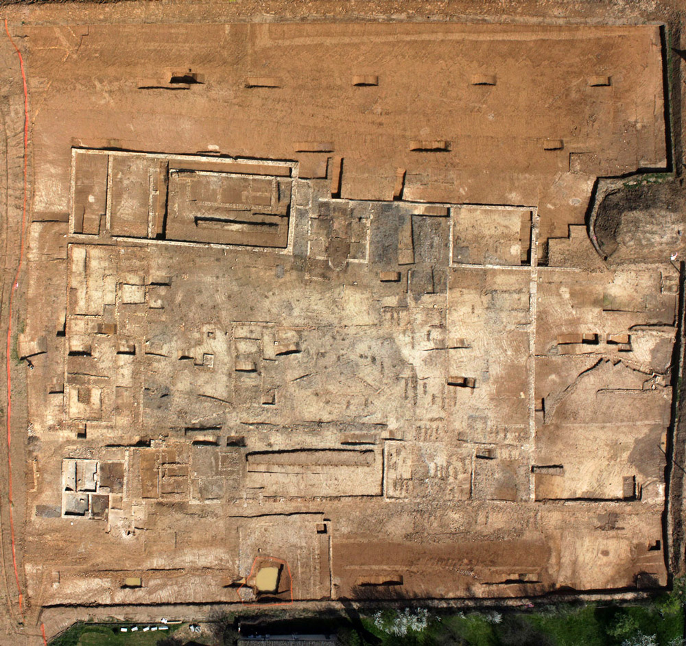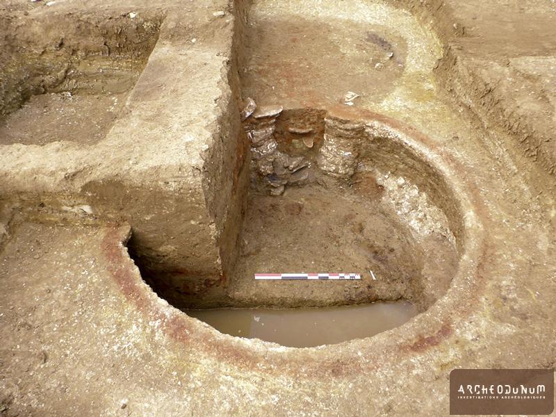 En contrebas, un vaste espace non bâti offre quelques structures empierrées et fossoyées qui respectent un certain alignement parallèle à la clôture nord. Deux puits jalonnent notamment cette propriété. L’étude du comblement du fond de l’un d’eux nous renseigne avantageusement sur la nature de l’activité qui se déroulait à proximité. L’abondance de carporestes de fruits, dont des noix, un noyau de pêche et des pépins de raisin, évoquent ainsi un coteau couvert de vergers et de quelques vignes dès l’Antiquité, données confirmées par l’analyse palynologique.