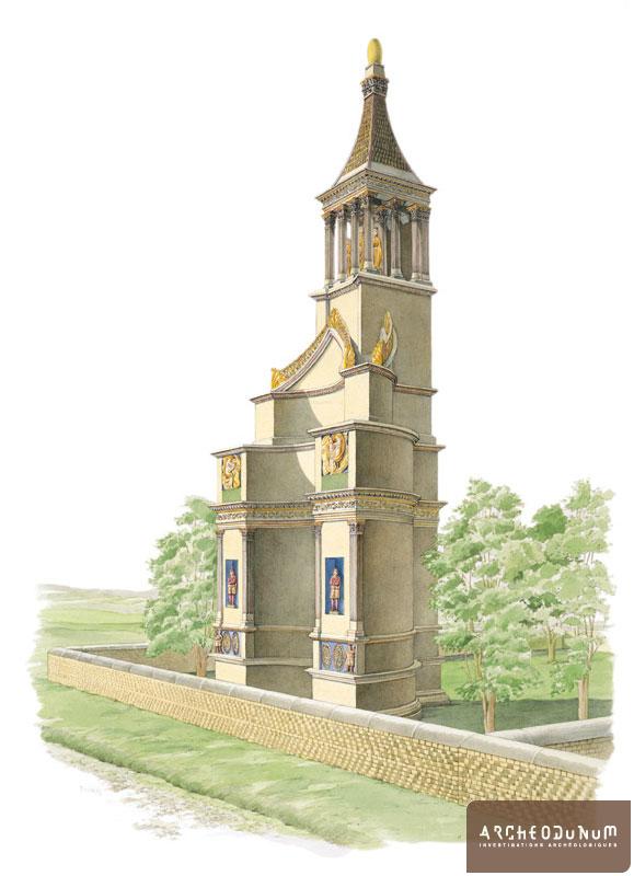 Au-dessus de ce premier ensemble se dresse un autre édifice de conformation très différente, et plus courante : un mausolée comparable à ceux de Cologne, Beaucaire ou encore Sarsina, composé d’une pile carrée, d’une chapelle et d’une flèche.