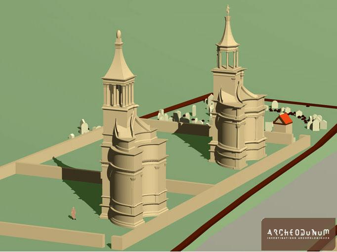 Chaque édifice est donc constitué, en quelque sorte, de deux « monuments » superposés, que l’on eût sans doute restitués voisins sans la contrainte d’un contexte archéologique probant. Dans une perspective géométrique et modulaire, on peut en revanche décliner les mausolées en trois registres : d’abord le massif évoquant l’arc de triomphe, avec socle, podium, corps à pilastres ou colonnes, et attique, le tout inscrit dans un carré de 16 modules de côté ; puis un registre transitoire haut de dix modules, qui comprend l’attique supérieur en retrait et son fronton, ainsi que la pile de la chapelle ; enfin la chapelle et sa flèche qui, comme le registre inférieur, totalisent 16 modules de hauteur.