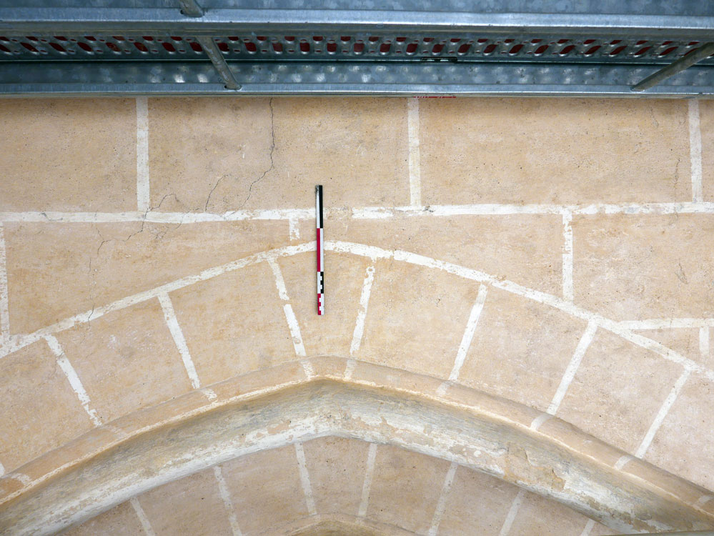 Les spécialistes ont aussi étudié les enduits qui recouvrent les élévations. Leurs observations sur le transept sud nous renseignent sur le grand chantier de décoration qui clôt la construction de la cathédrale. Ainsi, on apprend que, dans le bras sud, l’enduit beige et son décor de faux-appareil peint en blanc ont été appliqués du nord (croisée) vers le sud (portail).