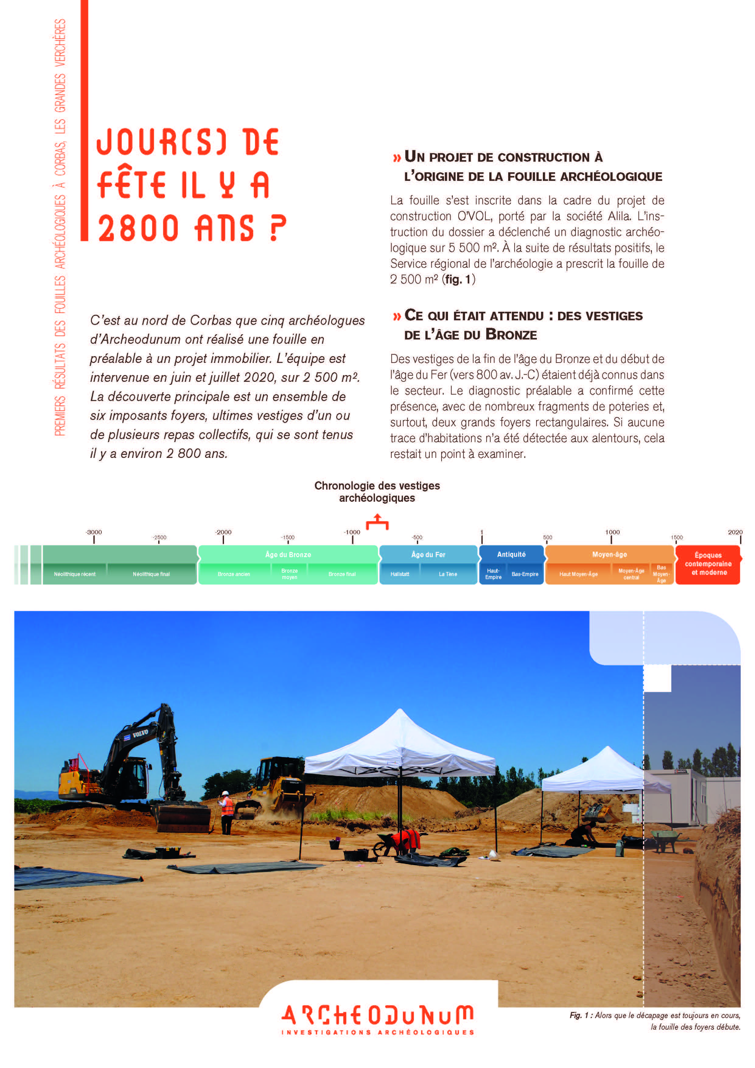 Au début de l'été 2020, une fouille préventive a été menée en amont de la construction d'un projet immobilier au nord-est de la commune de Corbas. La fouille menée sur 2450 m² a permis la mise au jour d'un réseau fossoyé probablement moderne à contemporain ; il est accompagné d'une fosse ayant livré un dépôt de bovidé. Toutefois, comme attendu par la prescription, la majorité de l'occupation s'attache à la Protohistoire avec un trou de poteau isolé du Bronze final I, quelques concentrations céramiques de la fin de l'âge du Bronze et surtout une batterie de six foyers à pierres chauffées de la transition Bronze final/Premier âge du Fer.