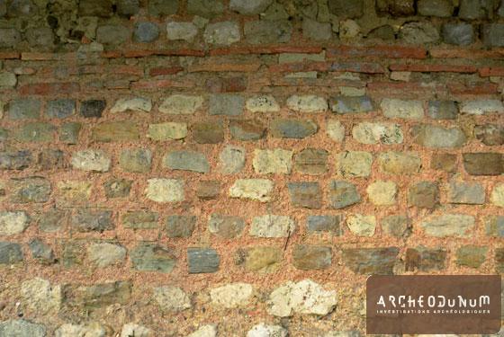 La mise au jour de la face interne de l’enceinte a montré l’état d’abandon dont la maçonnerie avait durablement souffert avant d’être masquée par la levée de terre. Le parement s’était délité sur presque toute la moitié supérieure de l’élévation, ce qui semble également avoir été le cas côté extérieur, où les lacunes ont été colmatées au XIXe siècle. Les parties conservées de ces parements montrent combien le traitement de la face externe a été privilégié : composé d’un opus mixtum régulier souligné de joints tirés au fer, il témoigne d’une attention esthétique qui tranche avec le traitement de la face interne, simplement montée en moellons à peine dégrossis dont un jointoiement beurré dissimule en partie les irrégularités. Il faut souligner qu’aucune trace d’aménagement attestant l’édification de constructions adossées à l’enceinte n’a été repérée, que ce soit dans les vestiges des maçonneries ou dans la stratigraphie de la levée de terre contiguë.