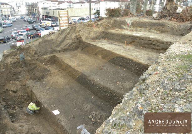 La première tranche d’un projet global de mise en valeur de l’enceinte antique du Bas-Empire de Dax s’est portée sur la portion orientale de l’ouvrage à l’angle de la Place de la Course et du cours Julia-Augusta. Elle a consisté en la réfection de l’escalier monumental établi dans la seconde moitié du XIXe siècle pour permettre d’accéder depuis la chaussée à la « promenade des remparts », aménagée au sommet de la levée de terre adossée à l’enceinte. L’implantation du nouvel escalier, prévue en recul d’environ 10 m par rapport au précédent, impliquait le dégagement du parement intérieur de l’enceinte au droit d’une de ses tours d’origine. Une analyse du parement interne de ces deux parties de la construction antique a été prescrite, ainsi qu’un sondage effectué dans les remblais accumulés dans la tour. Enfin, ces travaux d’aménagement procuraient l’opportunité de sonder sur la plus grande partie de sa hauteur la levée de terre adossée à la courtine par la mise en œuvre d’une coupe stratigraphique entrecoupée par quatre paliers pour des raisons de sécurité.