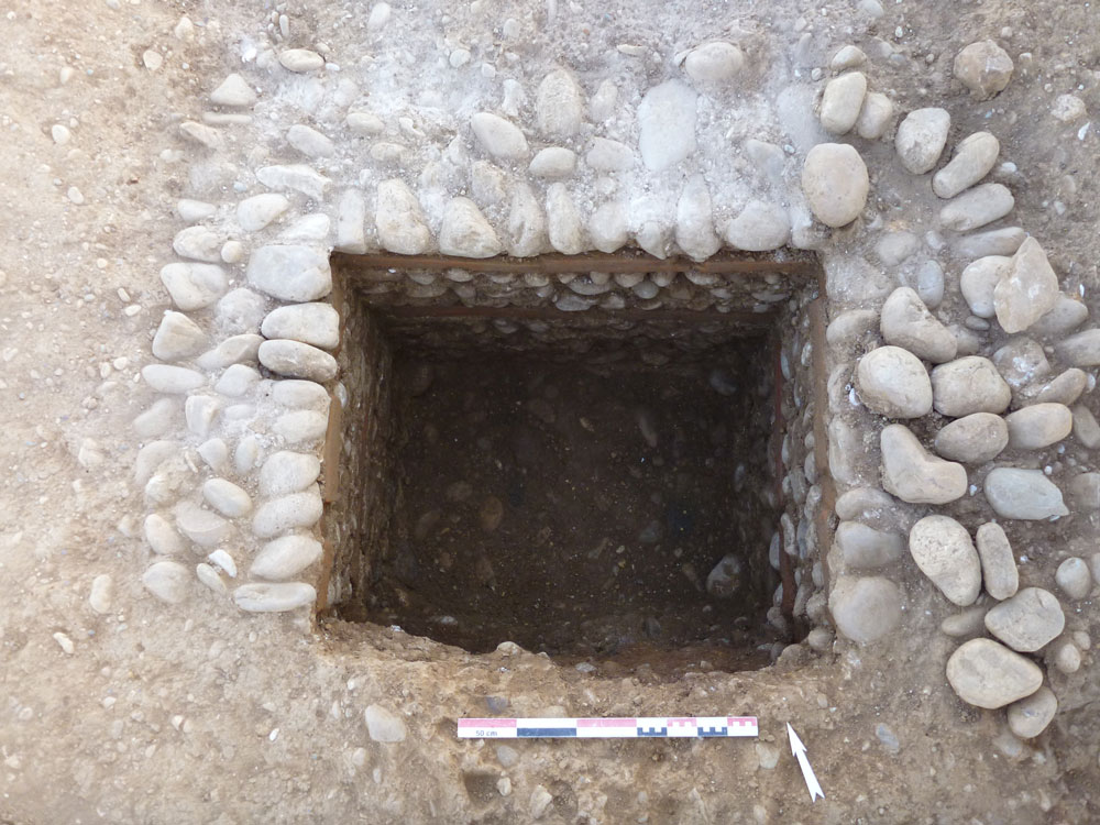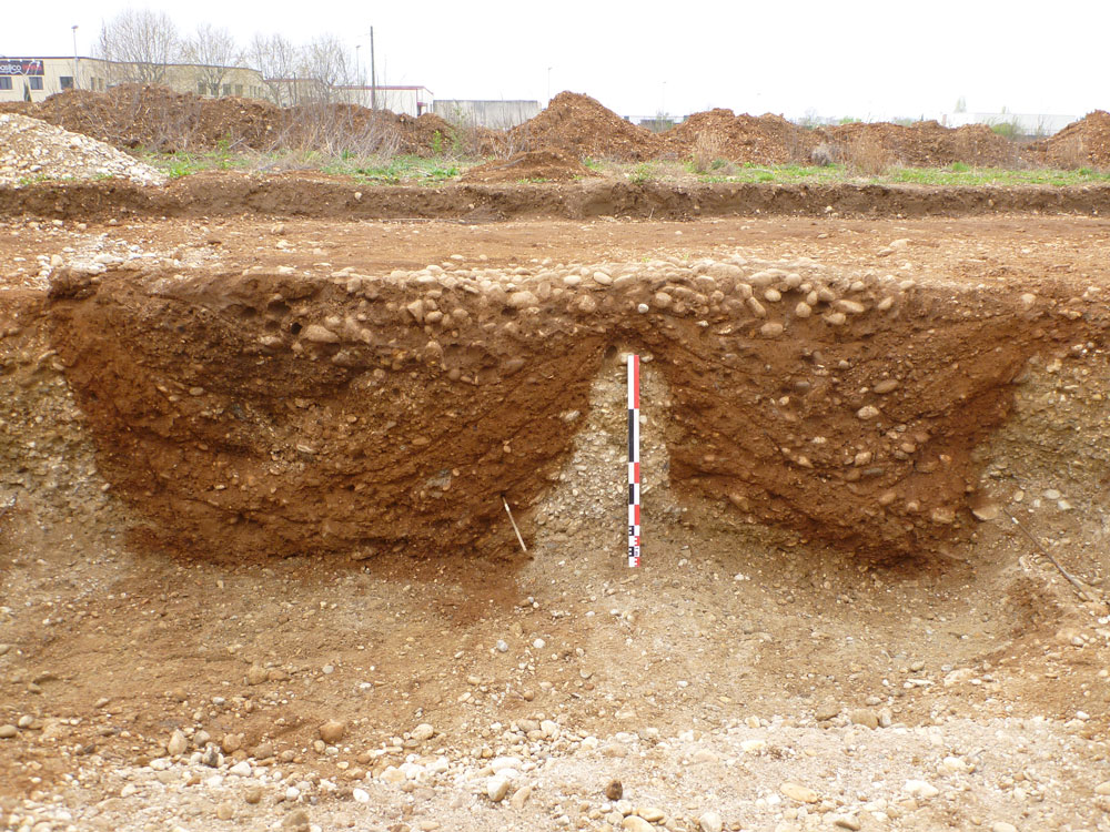 Le suivi en plan de l’axe du fossé bordier nord de la voie méridionale a permis la découverte d’une série de 21 grandes fosses, alignées le long de sa bordure nord et disposées plus ou moins régulièrement sur toute sa longueur. Plusieurs datations radiocarbones réalisées sur les différents niveaux de comblement, combinées aux relations de chronologie relative, permettent de placer leur fonctionnement dans une fourchette comprise entre la seconde moitié du IIe s. et le tout début du IVe s. ap. J.-C.