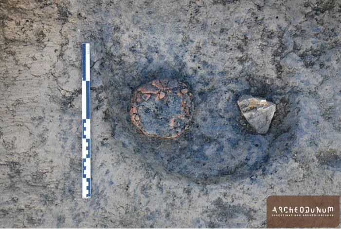 Les dépôts secondaires d’incinérations se situent à une centaine de mètres de l’habitat. Les huit structures mises au jour semblent faire partie d’une occupation funéraire de l’espace plus étendu dans lequel devait se trouver notamment les bûchers funéraires dont ces dépôts sont issus. Leur datation correspond à celle de l’occupation des bâtiments évoqués ci-dessus et leur lien est fort probable.