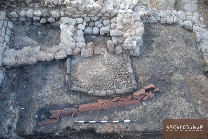 Une couche de colluvion issue d’un glissement de terrain scelle ces vestiges. Suite à cet événement dont l’ampleur et les conséquences nous échappent, le terrain est réaménagé et un bâtiment à vocation mixte est édifié. Ce dernier est composé d’une forge et d’une pièce d’habitation. Dans un deuxième temps, la partie artisanale est réaménagée mais la destination des nouveaux équipements n’a pas pu être déterminée. L’ensemble de cette phase a lieu dans le courant du IIIe s. ap. J.-C.
