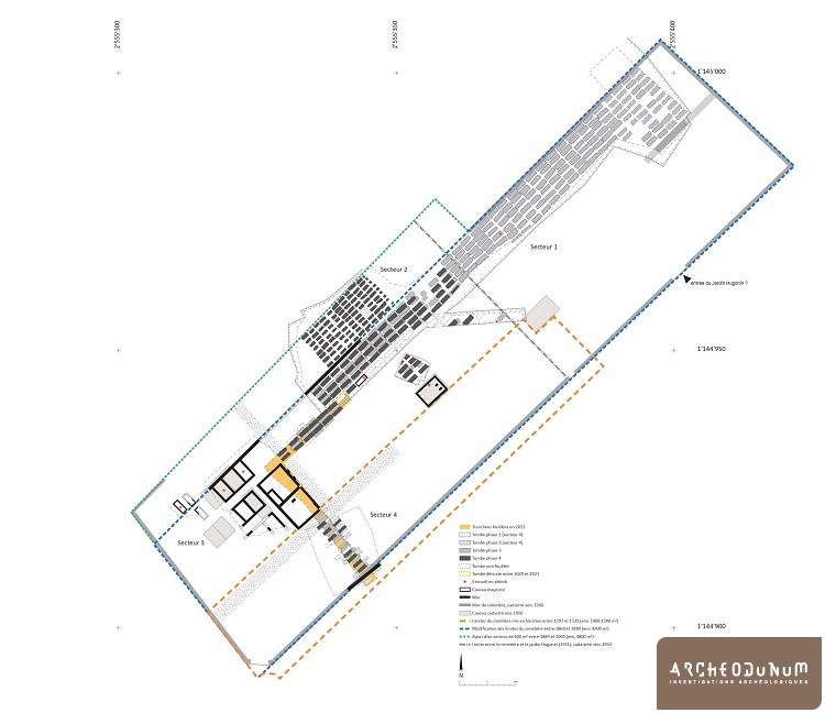 Les sépultures sont implantées « à la ligne » selon une trame régulière et dense, les fosses n’étant parfois distantes que de 15 cm, et suivent un axe nord-est/sud-ouest, la tête des défunt placées au nord-est. Les tombes sont réparties dans plusieurs secteurs, délimités par des allées ou des chemins. L’intervention de 2020 avait mis en évidence une seule phase d’inhumation dans le tiers nord et deux cycles d’utilisation dans la partie sud. En 2021, une partie de l’opération s’est déroulée dans la zone la plus ancienne du cimetière, où au moins quatre phases ont été repérées.