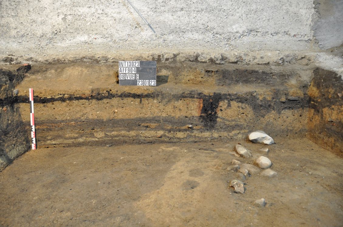 La petite surface investiguée (12.5 m2) a permis de documenter trois phases principales d’occupation ainsi qu’une fréquentation précoce de la zone. Les vestiges les plus récents considèrent les fondations de plusieurs maçonneries (M1, M3 et M4) datés par terminus post quem de la période claudio-néronienne. Les murs M3 et M4 sont édifiés parallèlement au decumanus nord de l’agglomération. Il s’agit très probablement des fondations de murets matérialisant la limite méridionale du portique de l’édifice. Quant au mur M1, de facture plus massive, il est interprété comme les fondations d’un mur porteur (mur de façade ?) orienté nord-est / sud-ouest. Au sud des maçonneries M3 et M4, on observe la présence de niveaux de graviers compactés témoignant de la succession des niveaux de circulation du portique ou des accotements de la voirie.