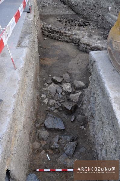 De mars 2015 à février 2016, l’installation de nouveaux réseaux d’électricité et le remplacement de conduites de gaz par la Ville de Lausanne a occasionné le suivi archéologique d’une tranchée longue de 600 m, ainsi que la surveillance de diverses excavations en marge du projet, sur une surface totale d’environ 1500 m2. La tranchée principale s’étend depuis le rond-point de la Maladière jusqu’au chemin de Bois de Vaux, en passant par la route de Vidy, à travers les quartiers orientaux et centraux du vicus de Lousonna. Près de la moitié du tracé a livré des vestiges, a priori exclusivement d’époque romaine (étude en cours). Les dimensions de la tranchée – en moyenne 2,40 m de large et 1,60 m de profondeur – ont permis de relever la plupart de ces vestiges en plan et en coupe, bien que certaines parties plus étroites (1,20 m) et/ou plus profondes (jusqu’à 4 m) ont nécessité des moyens techniques et un mode de documentation adaptés.