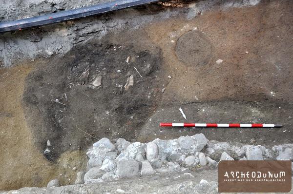 La chronologie des vestiges doit encore être précisée, en particulier par l’étude du mobilier céramique et des monnaies, mais il est déjà possible d’évoquer une phase d’occupation initiale, matérialisée par des trous de poteaux, des fosses dépotoir et des sols sablo-graveleux indurés. La typologie du petit mobilier (fibule à disque médian, stylet en os à corps renflé…) et le faciès visiblement peu romanisé de la céramique associée à ces structures suggèrent une datation augustéenne ou plus précoce (LTD2b), en tout cas dans la seconde moitié du 1er s. av. J.-C. À l’ouest du secteur, des empreintes d’éléments en bois également liées à cette première phase d’occupation sont comparables aux constructions sur poutres entrecroisées identifiées à 150 m de distance, sur le site de Chavannes 11 (état 1, vers 50 av. J.-C.), dont les meilleurs parallèles se trouvent dans les fortifications contemporaines de type murus gallicus (Berti Rossi, May Castella 2005).