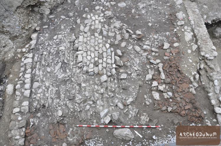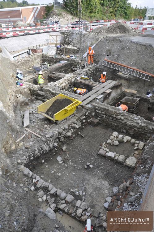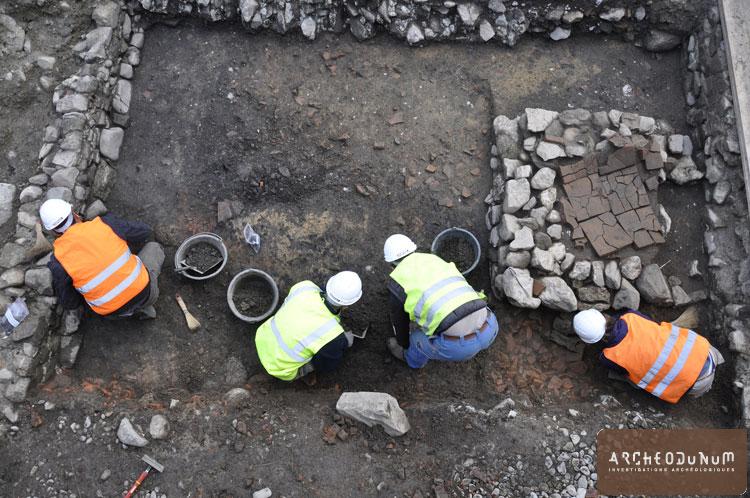 Trois propriétés contiguës situées le long de la rue principale de la ville romaine ont ainsi pu être explorées. L’occupation de ce secteur dans le quartier occidental du vicus se développe entre le milieu du 1er s. et le 3e siècle de notre ère. En front de rue, derrière les portiques et boutiques présumés, se concentrent les pièces d’habitation. L’une d’entre elles était aménagée sur une cave qui a livré un petit stock de tuiles destiné aux réparations de la toiture. Fait assez rare, plusieurs pans de murs effondrés après l’abandon des lieux ont été documentés dans l’emprise du bâtiment. L’ornementation de cette demeure nous est ainsi connue par des fragments de peinture murale découverts sur le sol d’une pièce sous son mur porteur. A l’arrière de ces espaces dévolus à l’habitat se rassemblent les traces d’activités artisanales, notamment de la métallurgie du fer. Un atelier de forgeron a ainsi été identifié grâce aux nombreux déchets (scories, battitures,…) conservés dans les niveaux charbonneux des sols. Les restes de consommation des habitants, tels que la vaisselle cassée et les ossements d’animaux, ont été jetés dans un dépotoir localisé en aval de l’atelier. La séquence des couches archéologiques atteint par endroits une épaisseur supérieure à 2 m qui concentre au moins 3 états d’occupation successifs. Si le dernier état est caractérisé par des constructions en maçonnerie, les premiers bâtiments étaient érigés en terre et en bois. Ce développement architectural correspond aux observations réalisées au centre de l’agglomération mais il intervient ici plus tard. On peut donc imaginer que ce quartier était occupé par une population plus modeste que celle du centre-ville. Le statut des habitants pourra être précisé grâce à l’abondance d’objets archéologiques récoltés lors de la fouille. Outre la vaisselle en céramique, qui représente la plus forte proportion du mobilier, on recense notamment des instruments de toilette (épingle, cure-oreille), des outils et ustensiles (couteau, clef, stylet, etc.), des bijoux (fibules, bagues, perles, etc.) ainsi qu’un petit autel domestique en calcaire destiné à honorer une divinité.