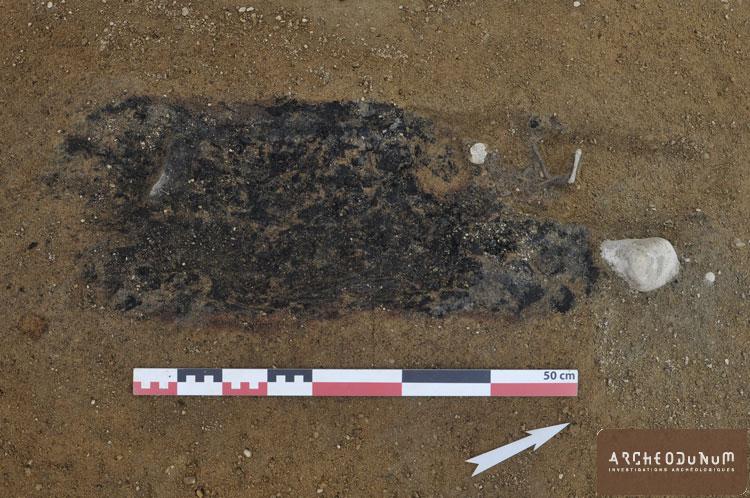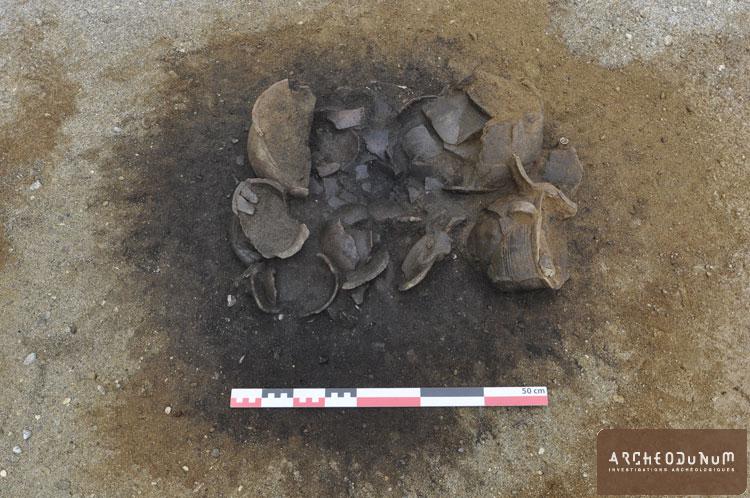 Les vestiges du Bronze final – période 2 – sont caractérisés par un enclos entourant une tombe centrale à crémation, datée de 950 av. notre ère (HaB1). Légèrement plus ancienne que les tombes identifiées dans le secteur, elle s’intègre néanmoins à la nécropole connue depuis les années 1950, qui s’étend jusqu’à Vidy-Ouest. Une chambre funéraire aménagée à l’aide de madriers a livré des résidus de crémation d’un individu de taille adulte, déposés dans un contenant périssable accompagnés d’une épingle en bronze et de deux récipients. Ce dépôt est recouvert par des offrandes en céramique (11 récipients) et une probable offrande alimentaire.