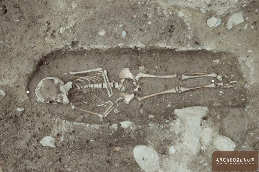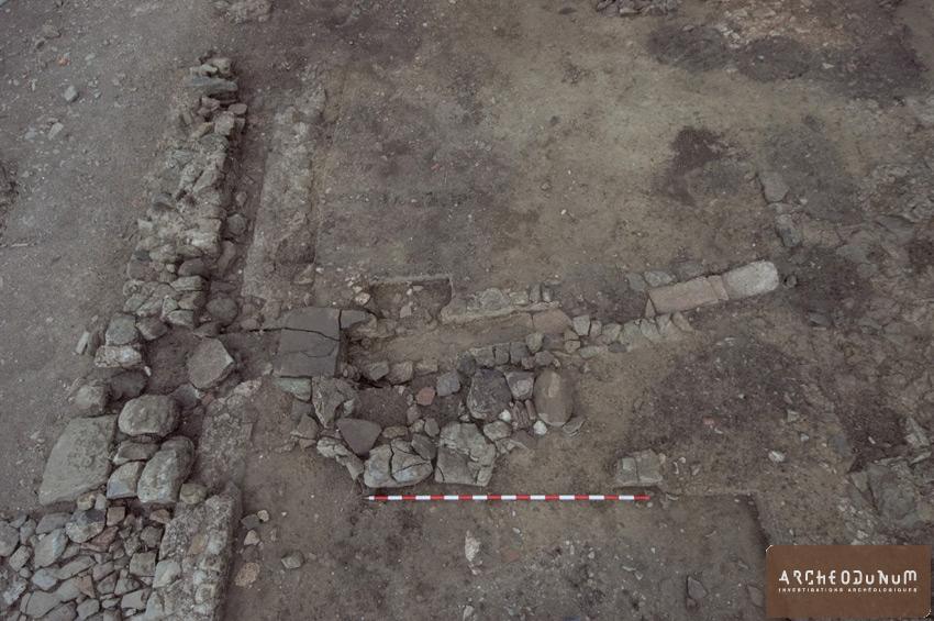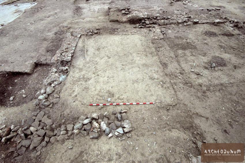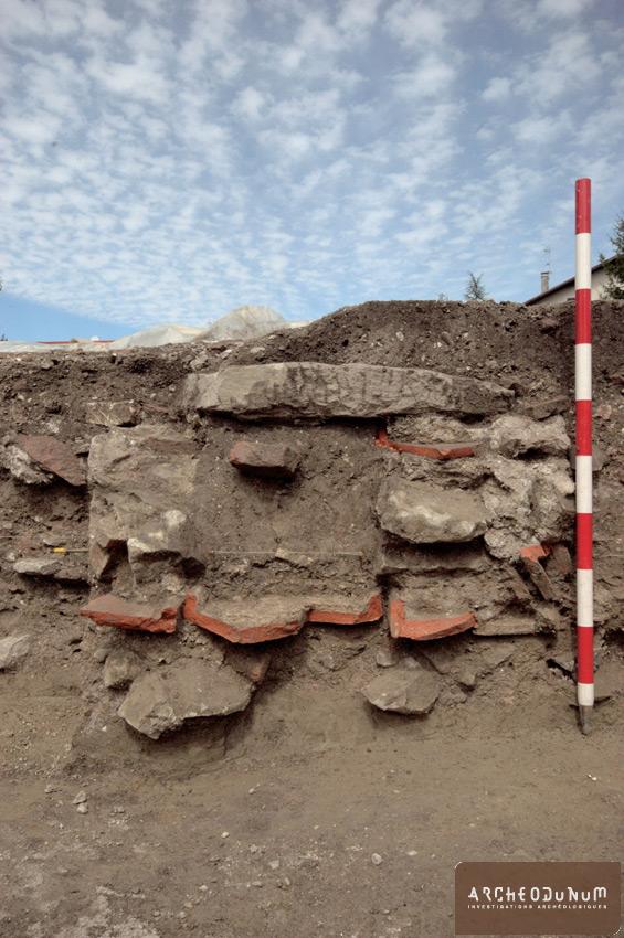 La société Archeodunum SA a réalisé une opération de fouille préventive dans la commune de Massongy à la route de l’église, au lieu-dit « Massongy-le-Bas » durant les mois de juillet et août 2008. Cette opération précède la construction d’un immeuble d’habitation (maître d’ouvrage Sarl Les résidences du Léman). La fouille a porté sur 900 m² centrés sur une terrasse comportant l’angle d’un bâtiment gallo-romain, sans doute périphérique au corps principal d’une villa. La nature des vestiges permet de proposer l’hypothèse d’un bâtiment à vocation thermale. Les débuts de l’occupation du site ne sont pas connus, mais doivent être relativement précoces si l’on se réfère à la première phase de démolition datant du milieu du Ier s. ap. J.-C. La suite se caractérise par une occupation avec diverses évolutions architecturales s’étendant jusqu’au IIIe-IVe s. ap. J.-C. sans doute. Le bâtiment est abandonné au IVe-Ve s. ap. J.-C., auquel se substituent des constructions plus légères. L’occupation de cet espace rural a donc perduré au moins jusqu’au Haut Moyen Age. La fouille a aussi mis en évidence une très grande quantité de fosses recoupant la majorité des structures romaines. Si la nature de ces creusements reste souvent énigmatique. Il est probable qu’il s’agisse de plusieurs phénomènes pouvant correspondre à des constructions légères, à la récupération des anciennes maçonneries, à l’extraction de matériaux ou à des chablis. Une tombe isolée a par ailleurs été dégagée au centre de la parcelle. Elle contenait les restes d’un enfant âgé de 7 à 9 ans. La datation par radiocarbone fournit une fourchette chronologique entre 1449 et 1641 ap. J.-C. Cette tombe peut être rattachée au cimetière de l’église Saint-Jean-Baptiste située non loin.