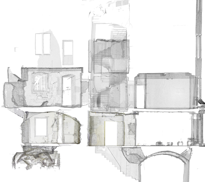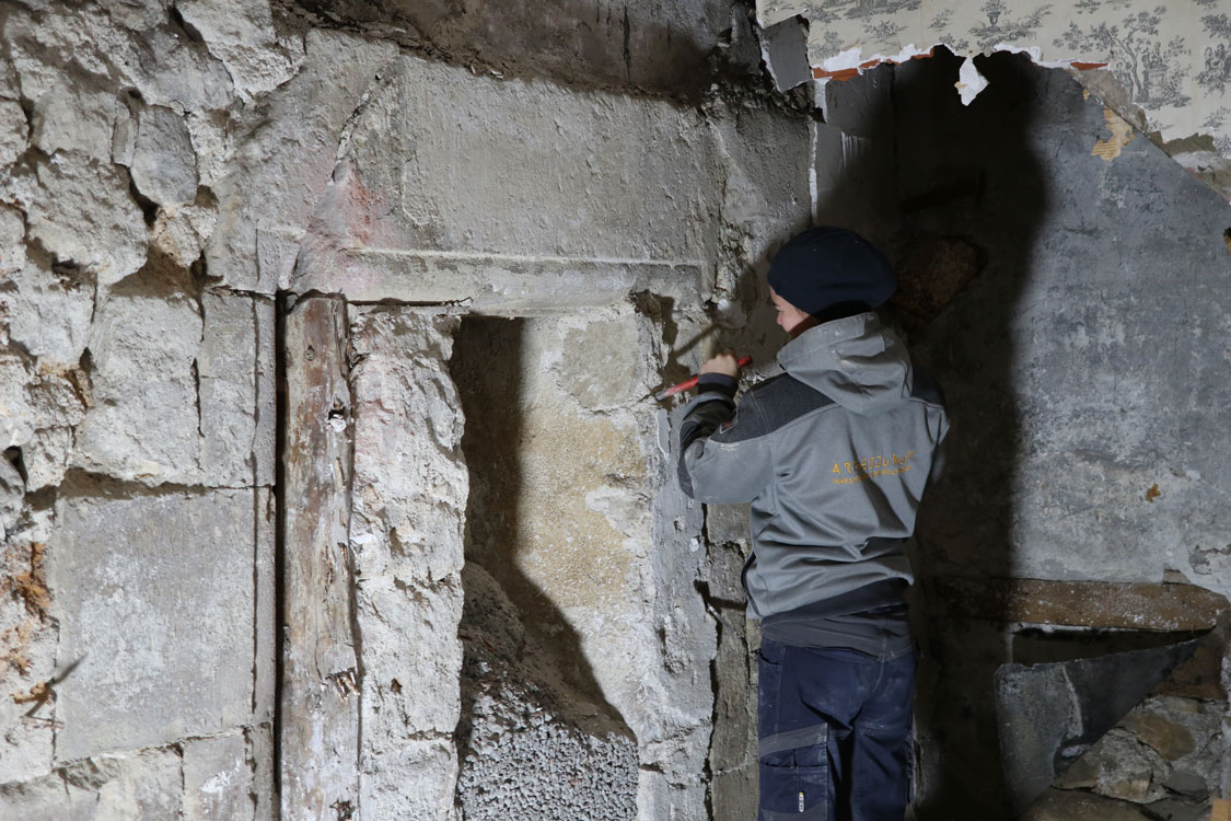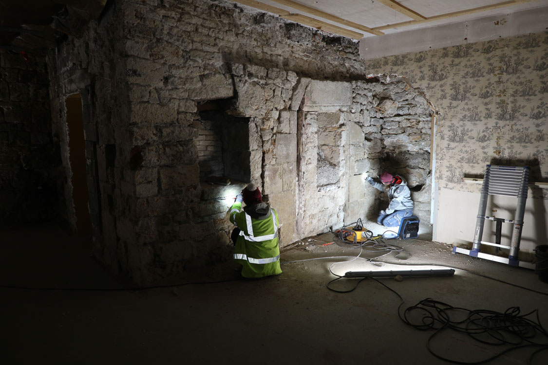 Les enduits muraux et les faux-plafonds ont été enlevés pour permettre une lecture archéologique des maçonneries et des plafonds. Afin de reporter toutes les observations, un relevé par scanner 3D a été réalisé. Les volumes de ces bâtiments complexes ont donc été restitués avec une grande précision. En complément de ce relevé, des photogrammétries ont été réalisées.