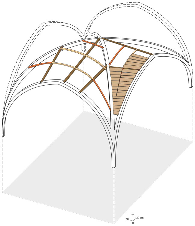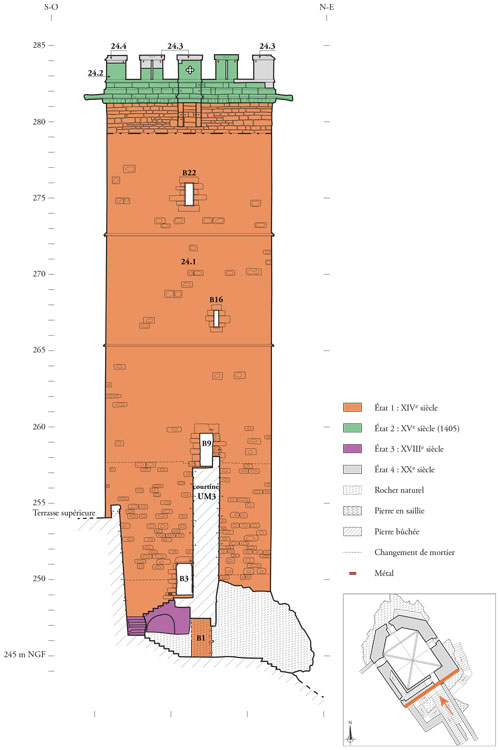 L’étude des tours de Montbard apporte de nouveaux éléments de connaissance sur le chantier de construction de ces deux édifices et leur évolution dans le temps. La tour de l’Aubespin, élancée et austère, revêt les attributs ostentatoires des édifices défensifs du début du XIVe siècle, auxquels contribuent largement ses nombreuses pierres à bossage rustique. En outre, ses murs de 2 m de large s’élèvent sur près de 40 m de haut, abritent des escaliers muraux et sont ouverts par d’étroites baies à coussiège ménagées dans des niches. Elle ne comporte pas d’aménagement de confort particulier, hormis des latrines au rez-de-chaussée. La tour fut édifiée entre 1312 et 1341, fourchette révélée par le croisement des données issues de l’archéologie et de l’étude des sources écrites. En effet, la date de 1312 correspond au terminus post quem donné pour l’abattage des couchis de la voûte du 1er étage, dont quelques fragments ont été analysés par dendrochronologie (Christophe Perrault, C.E.D.R.E.). Les arbres utilisés pour façonner les coffrages de la voûte ont donc été abattus après 1312. La limite de 1341 est donnée par la mention textuelle la plus ancienne connue pour la tour de l’Aubespin, qui provient d’un compte de châtellenie. Le texte évoque un système de fermeture pour une porte, indiquant que la tour est déjà construite à cette date. En outre, les comptes de 1340, qui sont les plus anciens dont on dispose pour Montbard, ne font pas état de frais liés à la construction de la tour de l’Aubespin, ce qui permet d’affirmer qu’elle était déjà achevée à cette date. L’analyse détaillée des maçonneries permet d’apporter des éléments de compréhension du chantier de construction, notamment par la restitution du système d’échafaudage interne, ancré au rez-de-chaussée et libre dans les étages. Également, les techniques de coffrage utilisées pour bâtir les voûtes d’ogives ont été restituées à partir des empreintes conservées dans le mortier des voûtains et dans les claveaux des arcs. L’étude permet aussi de constater que le chantier de construction fut probablement rapide, en témoignent l’appareillage qui tend à diminuer avec la hauteur, l’utilisation de pierres à bossage, ainsi que l’homogénéité des matériaux utilisés et des formes des ouvertures.