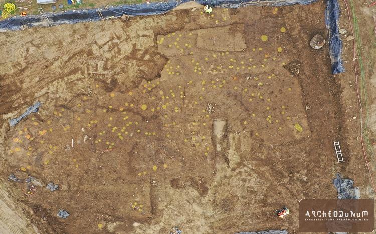 L’intervention réalisée sur quatre secteurs concernés par le projet immobilier a livré un nombre conséquent de vestiges avec un total de plus de 800 structures en creux, presque exclusivement de trous de poteau, réparties sur environ 0,5 ha. Elles témoignent de la présence de bâtiments en matériaux périssables, implantés de part et d’autre d’une butte morainique. Le contexte érosif important rend difficile la lecture de l’organisation spatiale et des modalités de l’occupation. L’absence quasi systématique de paléosols, seulement conservé très ponctuellement, en association avec les structures reconnues complique également l’identification de bâtiments. L’analyse par le radiocarbone de 24 échantillons permet néanmoins de discerner 14 étapes d’occupations, dont onze au Néolithique et trois aux âges des Métaux. À l’exception d’un foyer de La Tène isolé au nord du chantier, les vestiges des diverses périodes d’occupation semblent se répartir indistinctement de part et d’autre de la butte morainique.