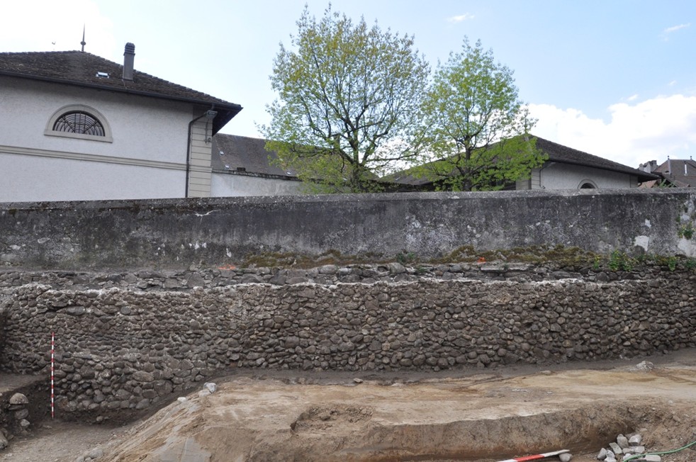 La fouille a également révélé des vestiges du système défensif de la ville basse érigé à la fin du 15e siècle, matérialisé par un mur de rempart et un large fossé parallèle à ce dernier qui occupent la partie occidentale du périmètre. Pour finir, un segment de mur de clôture du cimetière du 19e s. a également été documenté à l’extrémité sud-ouest.