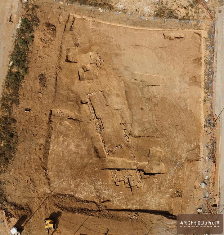 La période augustéenne est représentée principalement par un bâtiment agricole d’environ 25 m de long pour 7 m de large, équivalent à une surface d’environ 175 m². Il est composé de deux espaces internes matérialisés par un mur de cloison au centre duquel devait se trouver une ouverture (la preuve en est la conservation d’un seuil) permettant de faire le lien entre les deux pièces. A l’image de deux bâtiments agricoles du Haut-Empire (sur les sites du Cenel à La Cavalerie (12) et de Cordenade à Salles-la-Source (12)), la petite pièce devait servir d’habitat pour l’exploitant tandis que la grande pièce devait être réservée aux animaux. Deux autres murs de la même période se développent au nord et peuvent être le témoin d’un bâtiment annexe ou bien d’un enclos. Si la fonction agricole est la plus probable pour ce bâtiment, celle d’une bergerie, en comparaison avec le plan de bergeries antiques telles que celles de Cordenade, de la Crau ou du Cenel est séduisante.