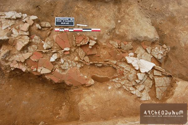 La fouille préventive menée au 19/20 Quai d’Alsace à Narbonne concernait une surface de 5438 m² , soit la totalité de l’emprise du projet de construction (parking souterrain et ensemble de logements résidentiels). Le site est localisé à l’ouest de la ville, en dehors des murs du Bas-Empire et dans un secteur réputé en marge de la ville du Haut-Empire. Néanmoins, de récentes opérations (21 Quai d’Alsace, rue Lamartine, diagnostic rue des Passerelles) ont montré l’importance du suivi archéologique de la zone. Le diagnostic, mené par T. Wibaut (INRAP), a révélé la présence de bâtiments, de bassins et d’une canalisation. Ce qui a motivé la prescription d’une fouille archéologique préventive par le Service Régional de l’Archéologie de Languedoc-Roussillon, réalisée par la société Archeodunum entre le 14 avril et le 13 juin 2008.