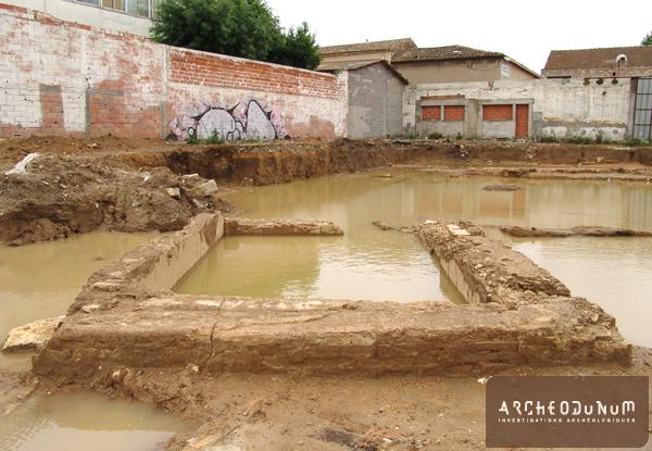 La fouille a révélé quatre phases principales d’occupation. La première (Auguste) se caractérise par la mise en place de deux axes de circulation nord-sud, délimitant un espace de 35 m de large environ (soit un actus) dans la partie occidentale de l’emprise. Les premiers bâtiments apparaissent au milieu du Ier siècle. Ils sont dans l’ensemble assez mal conservés et seul un grand édifice composé de cellules aux dimensions identiques et disposées selon un axe nord-sud a pu être identifié comme une série de boutiques (tabernae), bordées par un portique ouvert sur la voie centrale édifiée au cours de la phase précédente. La voie située à l’ouest est également longée par un portique. En partie est, les bâtiments sont trop mal conservés pour établir une interprétation satisfaisante de l’ensemble. Dans le même temps, ou légèrement après, plusieurs bassins sont construits ainsi qu’un important réseau de canalisations, manifestement utilisées pour évacuer leurs eaux. Le quartier abrite donc des édifices artisanaux et commerciaux, activités sans doute favorisées par la probable proximité de l’Atax, qui n’a pas pu être mis en évidence sur l’emprise des travaux.