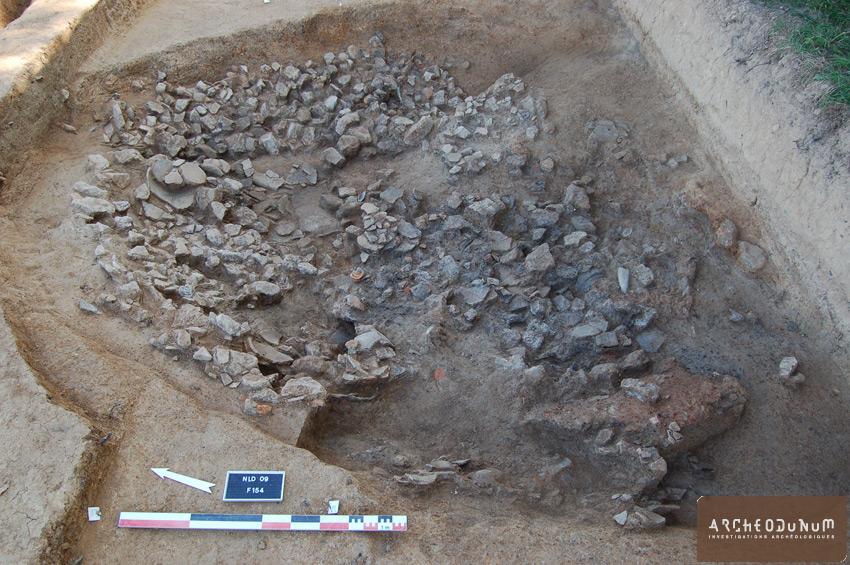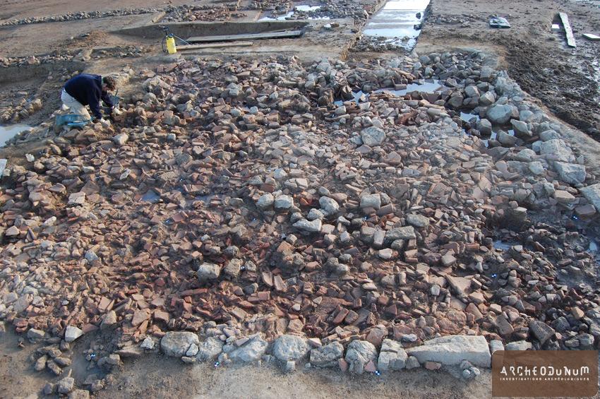 A l’ouest, en deçà d’un autre fossé perpendiculaire au précédent, un bâtiment allongé, de 15,50 m par 4,60 m possède une annexe au sud et une cour à l’avant, limitée par un mur d’enceinte de la parcelle, parallèle au fossé. Une pièce semi-enterrée borde cette cour au sud et conservait encore sa toiture effondrée et son pavage sous-jacent, interrompu localement par des négatifs de structures probablement en bois. Plusieurs foyers rectangulaires de dimensions variées gravitent autour de cette installation. A environ 40 m de part et d’autre du bâtiment deux aménagements matérialisent les angles du fossé parcellaire. Enfin, deux vastes dépressions peu profondes ont été comblées par un abondant mobilier céramique dans la partie nord-ouest de l’occupation.