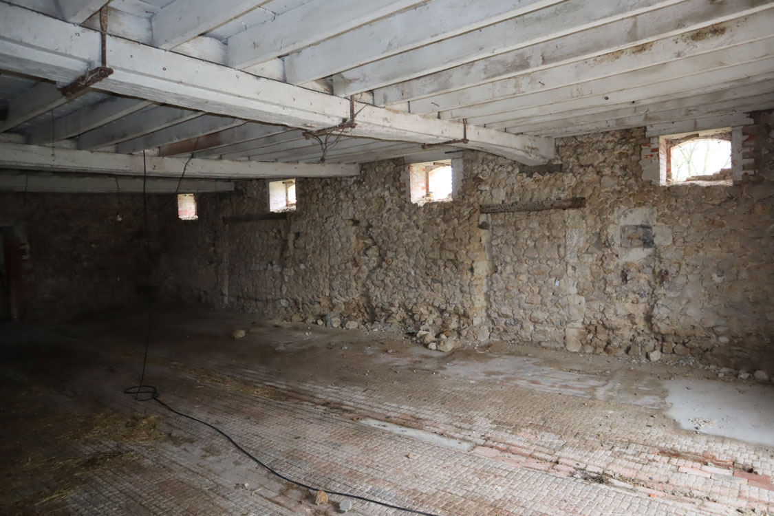 Le bâtiment économique situé à l’ouest de la cour va être transformé en habitation par les nouveaux propriétaires des lieux. Dans ce cadre, une opération d’archéologie préventive a été prescrite laquelle s’est déroulée avant la réalisation des travaux. L’édifice mesure 15,75 m de long pour 9,75 m de large hors-œuvre avec une hauteur de 11,35 m au sommet des pignons et de 4,5 m pour les gouttereaux. Actuellement, l’édifice est divisé en deux niveaux : un rez-de-chaussée d’une hauteur sous-plafond de 3 m et d’un étage sous charpente. Une extension accolée au pignon nord au cours du XXe siècle a été exclu de la prescription. L’objectif de l’intervention était d’établir un phasage chronologique et de déterminer ses usages.