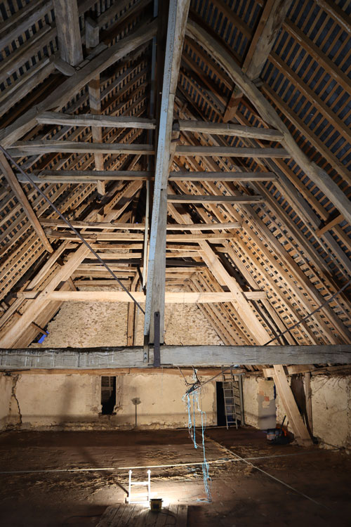 Grâces aux éléments architecturaux et aux datations archéométrique (dendrochronologie de la charpente et datation 14C), trois grands programmes architecturaux ont pu être mis en évidence. La phase primitive, datée du XVIe siècle, comprend l’édification du bâtiment dans son plan et ses dimensions actuelles ainsi que la partie septentrionale de la charpente. Des accès sont conservés en direction de l’ouest. Au XVIIIe siècle, des portes sont percées dans le mur oriental, permettant de desservir le bâtiment depuis la cour principale. Nous notons également l’ajout de contreforts à une période indéterminée afin de contenir le versement du gouttereau oriental. Enfin, la troisième phase consiste en un profond remaniement de l’édifice à la fin du XIXe ou du début du XXe siècle. Les accès se situent dorénavant sur les pignons nord et sud, les précédents ayant été comblés. Huit petites baies en brique sont créées dans les gouttereaux et l’actuel plancher de l’étage est mis en place. Cette phase comprend également une réfection de la charpente suite à la chute du mur pignon sud, dans le premier quart du XIXe siècle. Des reprises sont à noter durant le XXe siècle, notamment la création de stabules dans la partie basse du bâtiment ainsi que la création d’un accès, à l’étage, pour desservir l’extension accolée au nord.
