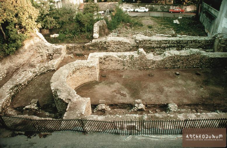 Cette aire quadrangulaire d’environ 36 m sur 36 m est entourée sur trois côtés d’un cryptoportique, galerie semi-enterrée, surmonté d’un portique ouvert sur la place au centre de laquelle devait se trouver un temple. Sur toute la hauteur de la galerie, les murs ceignant le cryptoportique sont doubles, ménageant un vide sanitaire de 0,45 m de large destiné à empêcher les infiltrations d’eau. Des piliers en pierre de taille, disposés axialement à la galerie, sont destinés à soutenir une poutre ou une plate-bande sur laquelle reposait le solivage du plancher du portique supérieur. Des petits socles de molasse, alignés le long des murs, recevaient probablement des montants de bois ou de pierre contribuant vraisemblablement aussi au soutien du plafond. Il faut ajouter à ces éléments la présence de trois exèdres, dont deux sont situées aux extrémités de la galerie ouest. La troisième, plus profonde, est disposée dans l’axe du monument. Quant au sol du cryptoportique, il était de terre battue tandis que les parois étaient revêtues d’un enduit blanc crème sans décor. Nul doute que l’éclairage du couloir devait être assuré par des soupiraux ouvrant sur la cour, mais les vestiges, trop arasés, n’en ont révélé aucune trace.