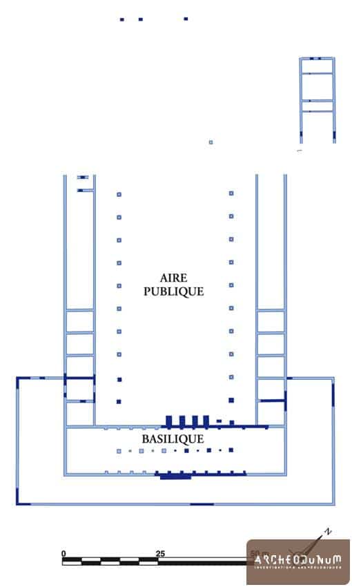 Divisée en deux nefs par une rangée de piliers axiaux, elle a été construite sur une galerie semi-enterrée (cryptoportique) clairement identifiée grâce aux coupes de terrain. Il est d’ailleurs probable que seul le cryptoportique était divisé en deux nefs, les piliers servant à soutenir le plancher d’une vaste salle à nef unique. Un mur maçonné d’environ 0,60 m d’épaisseur semble former une véritable enceinte autour de la basilique. Provisoirement, nous l’attribuons volontiers à un dispositif de soutènement d’une esplanade entourant la basilique et destiné à régulariser la pente du terrain qui descend vers l’est.