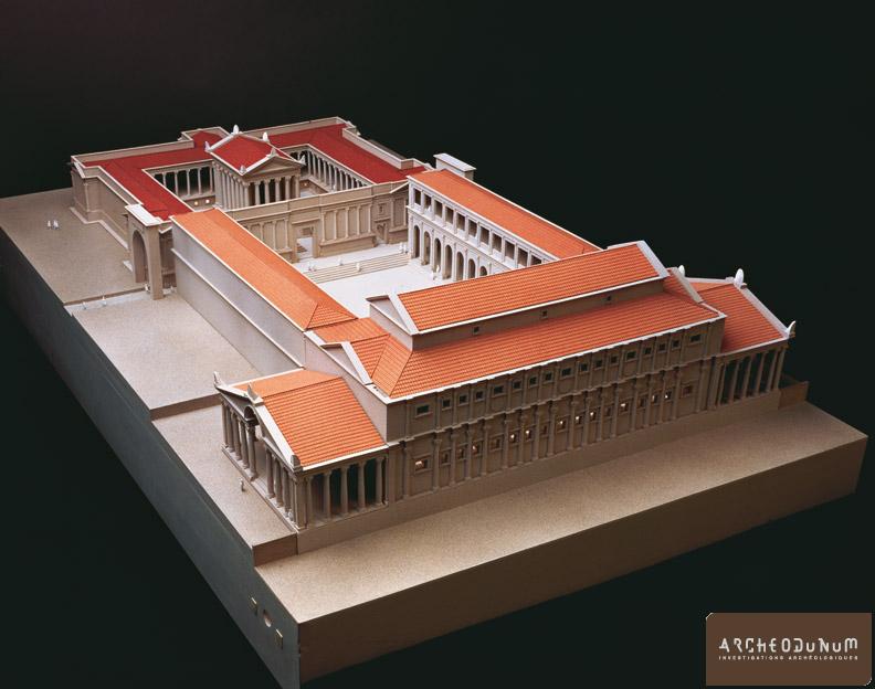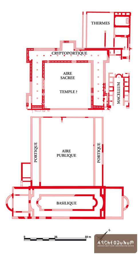 Le forum comprend une aire sacrée, une place publique et une basilique, dans laquelle se traitent les affaires politiques, administratives et commerciales. Accolés à ce complexe, la curie, le marché alimentaire (macellum) et les bains sont les autres édifices qu’il convient d’ériger afin de concentrer au cœur de la ville les principaux bâtiments publics et de respecter les schémas urbains en vigueur.