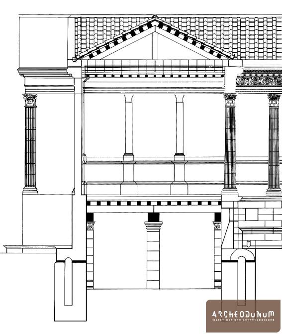 Un mur, large de 1,30 m, sépare la place publique de celle du temple. Une interprétation, effectuée pour la réalisation de la maquette du forum, restitue ce mur sur une hauteur identique à celle des portiques latéraux. Cette véritable façade serait ornée de colonnes engagées et percée uniquement de trois ouvertures donnant accès, par quelques marches, à l’aire religieuse. Ainsi, depuis la place publique, le visiteur n’avait aucune vision directe du temple qui était enfermé dans une véritable enceinte qu’exigeait son caractère sacré.