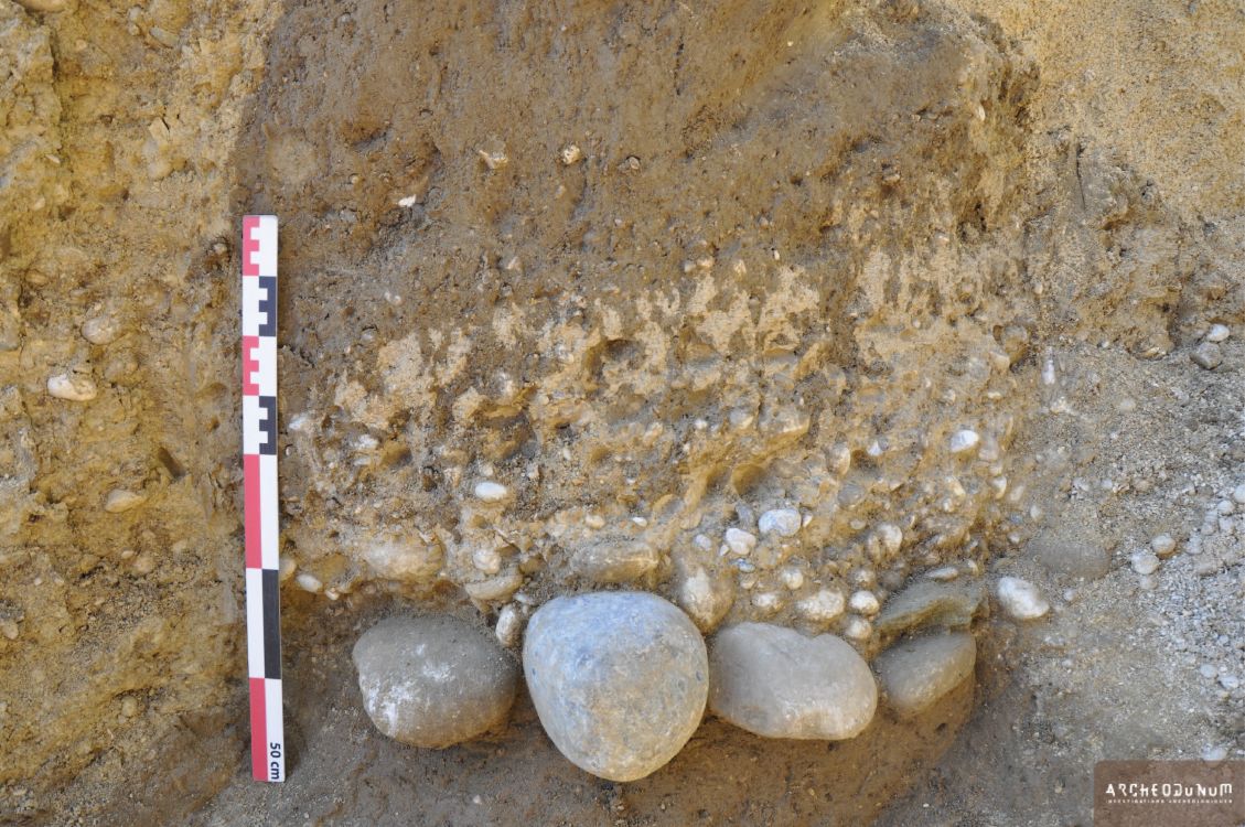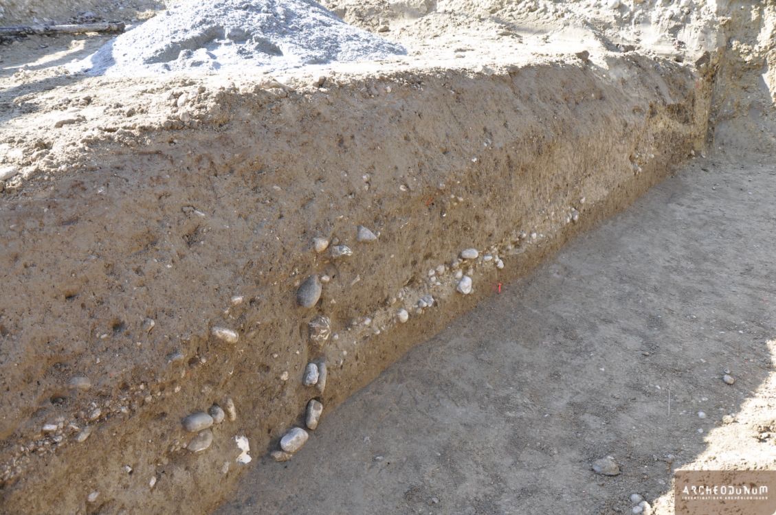 La réalisation d’une tranchée à l’extrémité occidentale du chemin du Passon, au croisement avec le chemin de l’Étraz, a permis de découvrir un nouveau tronçon de la voie antique Lausanne-Yverdon. Son tracé est en effet encore peu documenté dans le quartier des Granges Saint-Martin, très impacté par l’urbanisation. Visible en coupe sur environ 4 m, ce niveau de route ancienne est constitué d'une chape de gravillons, de graviers et de galets (0,5 à 15 cm) pris dans une matrice sableuse indurée, de couleur beige-blanc. Par endroits, cette chape est soutenue par un radier (statumen) composé de boulets (12 à 20 cm) posés à plat. La limite orientale de la voie est marquée par la présence d’un fossé bordier en cuvette, d’une largeur maximale de 65 cm ; la limite occidentale n’a pas été atteinte lors de ces travaux.