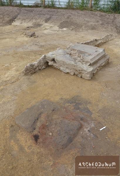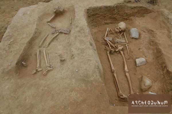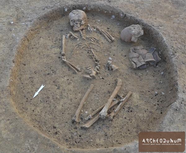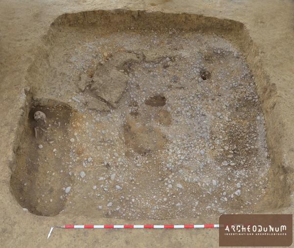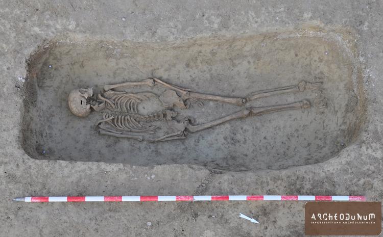 Une sépulture à inhumation a également été mise au jour lors du terrassement. En l’absence de mobilier, une analyse 14C a été réalisée sur le squelette et le place au Second âge du Fer, entre La Tène Ancienne et La Tène Moyenne (ICA 14C-5736, 2310 ± 40 BP, 470-340 BC (65,2 %), 320-200 BC (30,3 %), cal. 2 sigma). Cette sépulture est pour l’instant isolée, située à une distance d’environ 200 m par rapport au cimetière médiéval documenté en 2018.