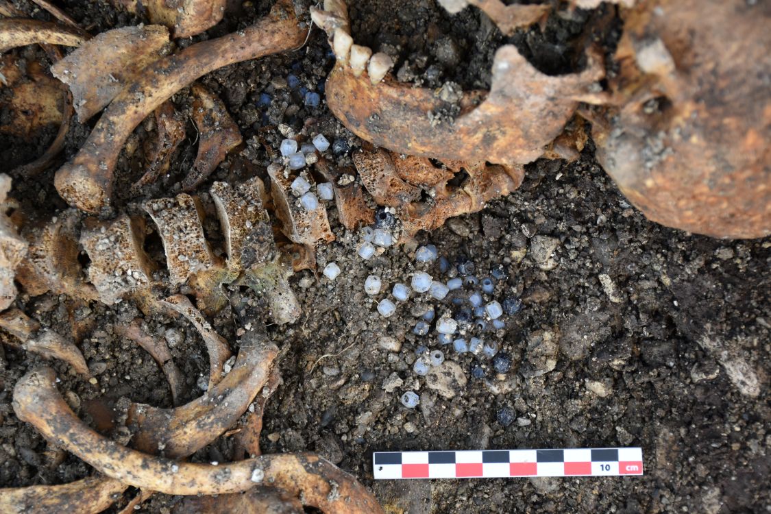 Les sépultures sont implantées en quatre lignes régulières, distantes de 20 à 30 cm, à l’exception d’une tombe placée parallèlement au mur occidental. Les fosses, disposées en quinconce, ont une orientation majoritairement ONO-ESE, avec la tête du défunt à l’ouest. Trois individus ont cependant la tête à l’est et dans la sépulture axée sud-nord, la tête du défunt est au sud. La découverte d’éléments d’assemblage en fer (clous et tiges), de pellicules de bois ou de traces organiques atteste l’utilisation d’un cercueil cloué pour chaque sépulture. Elle est généralement corroborée par les observations archéothanatologiques, indiquant une décomposition du corps survenant en espace vide.